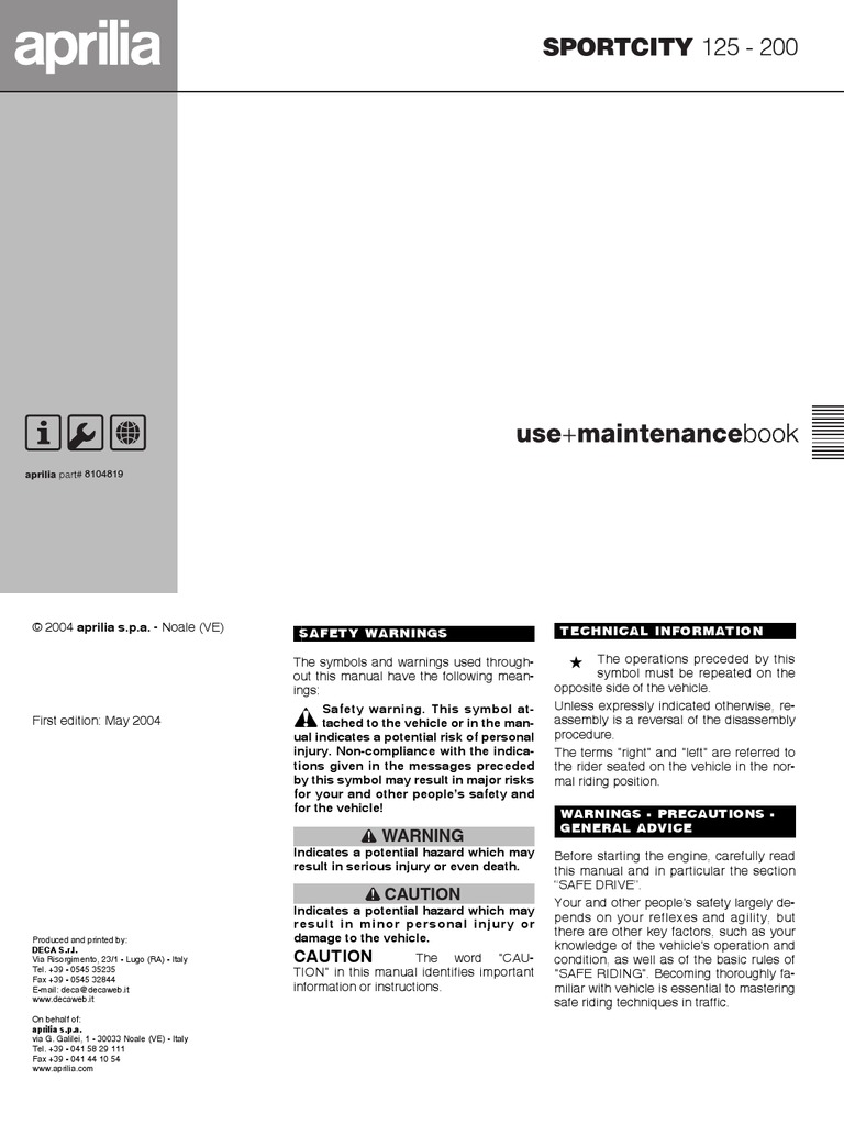 Aprilia Sportcity 125 200 04 Manual | Headlamp | Vehicles