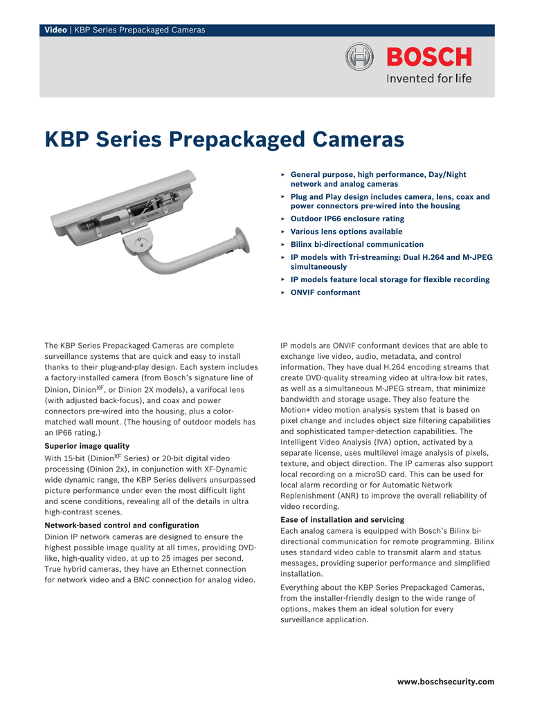 Dinion IP Camera Table of Contents | en 5 Bosch Security Systems Installation and Operation Manual AR18-10-B006 | v1.1 | 2010.06 7.4.1 Alarm connection 43 7.5 Connection established 44 7.5.1 LIVEPAGE 44 7.5.2 RECORDINGS 44 7.5.3 SETTINGS 44 8 Basic Mode 46 8.1 Basic Mode menu tree 46 8.2 Device Access 47 8.2.1 Camera name 47 8.2.2 Password 47 8. Video | LTC 0485 Series DinionXF Color Cameras LTC 0485 Series DinionXF Color Cameras Bosch Security Systems, Inc. 130 Perinton Parkway Fairport, New York, 14450, USA Fax: +55 19 2103 2862 latam.boschsecurity@bosch.com www.boschsecurity.com. The Bosch Security Academy offers classroom training sessions as well as online tutorials. a partner. As a Bosch Integration Partner, you profit from access to an increasing number of services. Learn more. EOL: LTC Series Lensed Cameras. Pre-assembled units with camera and varifocal lens included LTC 0435 Series, LTC 0455 Series, LTC.