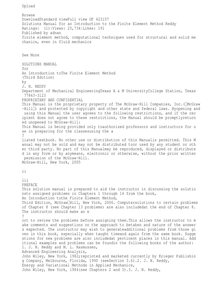 Finite Element Method Solution Manual - Download a first course in the finite element method solution manual for FREE. All formats available for PC, Mac, eBook Readers and other mobile devices. Download a first course in the finite element method solution manual.pdf. Solution of finite element equilibrium equationsinstatic analysis 9-1 10. Solution of finite element equilibrium equationsin dynamic analysis 10-1 1l. Mode superpositionanalysis; time history 11-1 12. Solution methodsfor calculationsof frequencies andmodeshapes 12-1. SOME BASIC CONCEPTS OF ENGINEERING ANALYSIS LECTURE 1 46 MINUTES I-I. SolIe basic ccnacepls of eugiDeeriDg ualysis. Finite Element Method Magnetics Version 4.2 User’s Manual October 25, 2015 David Meeker [email protected].4 FINITE ELEMENT METHODS FOR FLUIDS FINITE ELEMENT METHODS FOR FLUIDS. O. Pironneau (Universit´e Pierre et Marie Curie & INRIA) (To appear in 1988 (Wiley)) MacDraw, MacWrite, Macintosh are trade marks of Apple Computer Co. TEXis a trade mark of the American Math. Society. TEXtures is trade mark of Blue Sky Research Co.. telerepsathome.org/lean-six-sigma-for-dummies.pdf 1 telerepsathome.org/finite-element-method-5th-edition-solution-manual.pdf. Hybrid Dummies are the widely used safety measurement tool to assess the injury Finite Element Analysis (FEA) is an imperative tool in automotive world to 018-Sharma-VE-CommercialV.pdf — PDF document, 64 kB (66087 bytes).. Solution Manual For An Introduction To The Finite Element J.N. Reddy's, An Introduction to the Finite Element Method, third edition is an update of one of the most popular FEM textbooks available. The book retains its strong conceptual approach, clearly examining the mathematical underpinnings of FEM, and providing a general approach of engineering application areas..