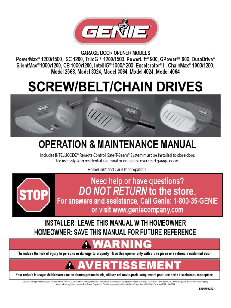 Please note: Owner's Manuals for Commercial Operators and Doors are not available online. Please contact your local Overhead Door distributor by calling 1-800-929-3667 for assistance with commercial garage door products.. Garage Door Opener AccessoriesLooking for Leading-Edge Technology or the Perfect Update/Replacement?Genie Has the Answer!®Did your garage door close?Genie-Net technology “tells” you!™Closed Confirm™ Wireless RemoteLeading-EdgeTechnology(Works with Revolution Series 1500, 1200 and 1000 Models)• Sleek and compact design• Beeps and. Garage Door Won’t Stay Closed Garage Door Won’t Close. This is a very common complaint that’s relatively easy to fix. In most instances this “garage door won’t stay closed” problem arises from improperly adjusted limits..