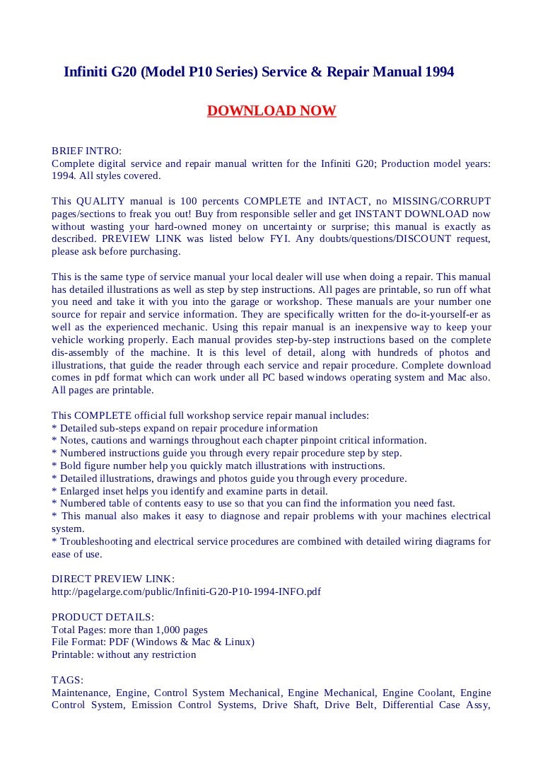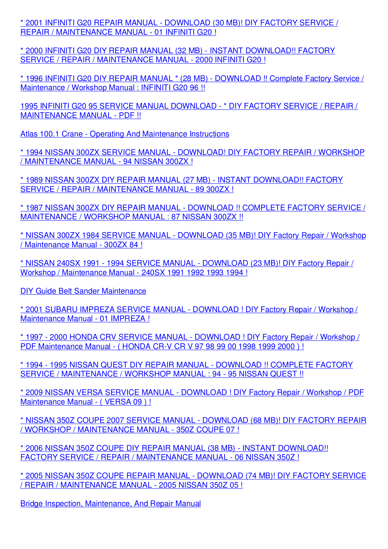 Infiniti G20 Complete Workshop Repair Manuals 1994 1995 - infiniti g20 full service repair manual 1994 1995 repair manualsworld - bloombergthe times & the sunday timesホームï¼ä¸‰éƒ·å¸‚å¬å¼ã‚µã‚¤ãƒˆ. infiniti g20 complete workshop repair manual 1994 1995 Mon, 21 Jan 2019 00:41:00 GMT infiniti g20 complete workshop repair pdf - Daewoo Matiz Kalos. 1996 Infiniti G20 Service Manual Instant Down by AngelicaWoodward 1996 Infiniti G20 Service Manual Instant Down by AngelicaWoodward - issuu Deals Dodge Challenger User Manuals Infiniti Q45 1995 Factory Service Repair Manual.pdf by Linda Pong.If so, here is a complete service/repair manual for 1994 Infiniti G20. It contains detailed instructions and step by step diagrams for all workshop It contains detailed instructions and step by step diagrams for all workshop. Infiniti G20 Complete Workshop Repair Manual 1994 1995 Ebook Infiniti G20 Complete Workshop Repair Manual 1994 1995 currently available at www.startupwoking.co.uk for review only, if you need complete ebook Infiniti. Free Doc Format Infiniti G20 Complete Workshop Repair Manual 1994 1995 by Edward Albee contains important information and a detailed explanation.