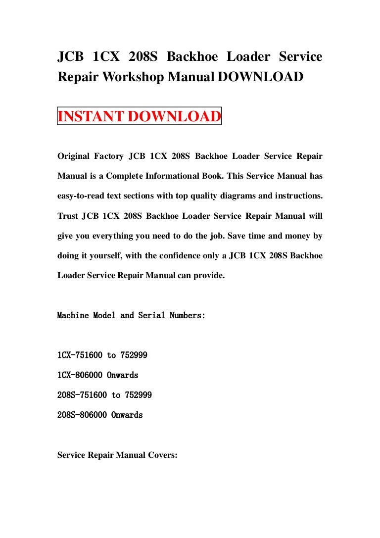 Go ahead to take this service manual.Please contact us if with any problems. This manual can be used by anyone from a first time owner/amateur to a professional technician.Easy to read type,And give you all the information needed to do the procedure correctly.Keep this shop manual. 1CX-751600 Onwards 208S-751600 Onwards Service Repair Manual Covers:- General Information Care and Safety Maintenance Attachments Body and Framework. Document Jcb 1cx 208s Backhoe Loader Service Repair Shop Manual is available in various formats such as PDF, DOC and ePUB which you can directly download and save in.