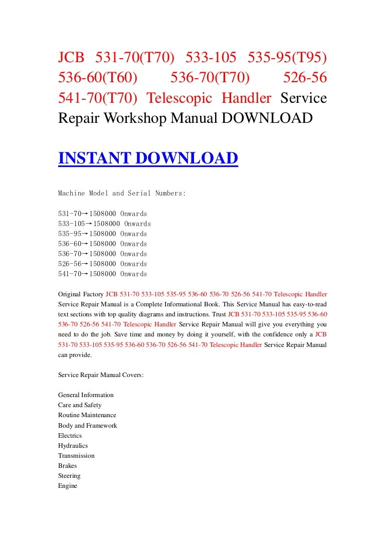 Jcb 541 70 Service Manual - Title: JCB 541-70 TELESCOPIC HANDLER Service Repair Manual, Author: 163114103, Name: JCB 541-70 TELESCOPIC HANDLER Service Repair Manual,. It is a complete workshop service repair manual which includes each and every detail of the machine. The diagrams are very precise and easy to read. This document is printable, without restrictions, contains searchable text, bookmarks, cross links for easy navigation. It contains step by step instructions, assemble an. JCB 541-70 Telescopic Handler Service Repair Manual meets all your information needs to repair or make some adjustments to your JCB 541-70 Telescopic Handler Service Repair Manual. This manual is intended as a handy, easy to read reference book for the mechanics and DIY persons..JCB 541-70 Telescopic Handler Service Repair Manual meets all your information needs to repair or make some adjustments to your JCB 541-70 Telescopic Handler Service Repair Manual. This manual is intended as a handy, easy to read reference book for the mechanics and DIY persons.. JCB 530B-HL WORKSHOP SERVICE REPAIR MANUAL; JCB 531-70 (T70) 533-105 535-95 (T95) 536-60 (T60) 536-70 (T70) 526-56 541-70 (T70) Telescopic Handler Service Repair Workshop Manual DOWNLOAD; JCB 532 LOADALL SPARE PARTS CATALOG MANUAL S/N: 1036593 1166798; JCB 532-120 Telehandler Operator Manual S/no: 1016450 and up;. JCB Service Manual Download: JCB Dump Truck: JCB HTD5 Tracked Dumpster Service Repair Workshop Manual 526-56, 550-80, 531-T70, 541-T70, 536-T60, 535-T95, 536-T70, 550-T80 Telescopic Handler Service Manual. JCB 531-70, 535-95, 541-70 LOADALL (ROUGH TERRAIN VARIABLE REACH TRUCK) Service Repair Manual (S/N: from 2902000 onwards – EN – 9813.
