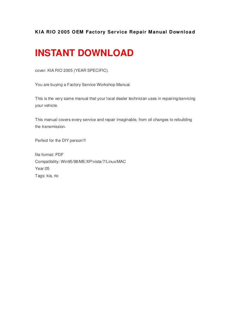 Kia Rio Repair Manual [2005] Type: Workshop and repair manuals. Quantity of CD: 1 DVD Developer : Kia Motors Year: 2005
