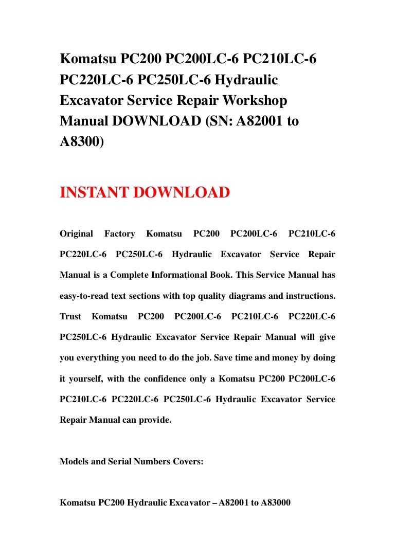 Komatsu Pc200 Pc200lc 6 Pc210lc 6 Maintenance Manuals - Komatsu PC160-6K, PC180LC-6K & PC180NLC-6K Hydraulic Excavator Service Shop Repair Manual. The Service shop repair manual offers detailed servicing instructions and will give you complete step by step information on repair, servicing, preventative maintenance & troubleshooting procedures for your Komatsu excavator..