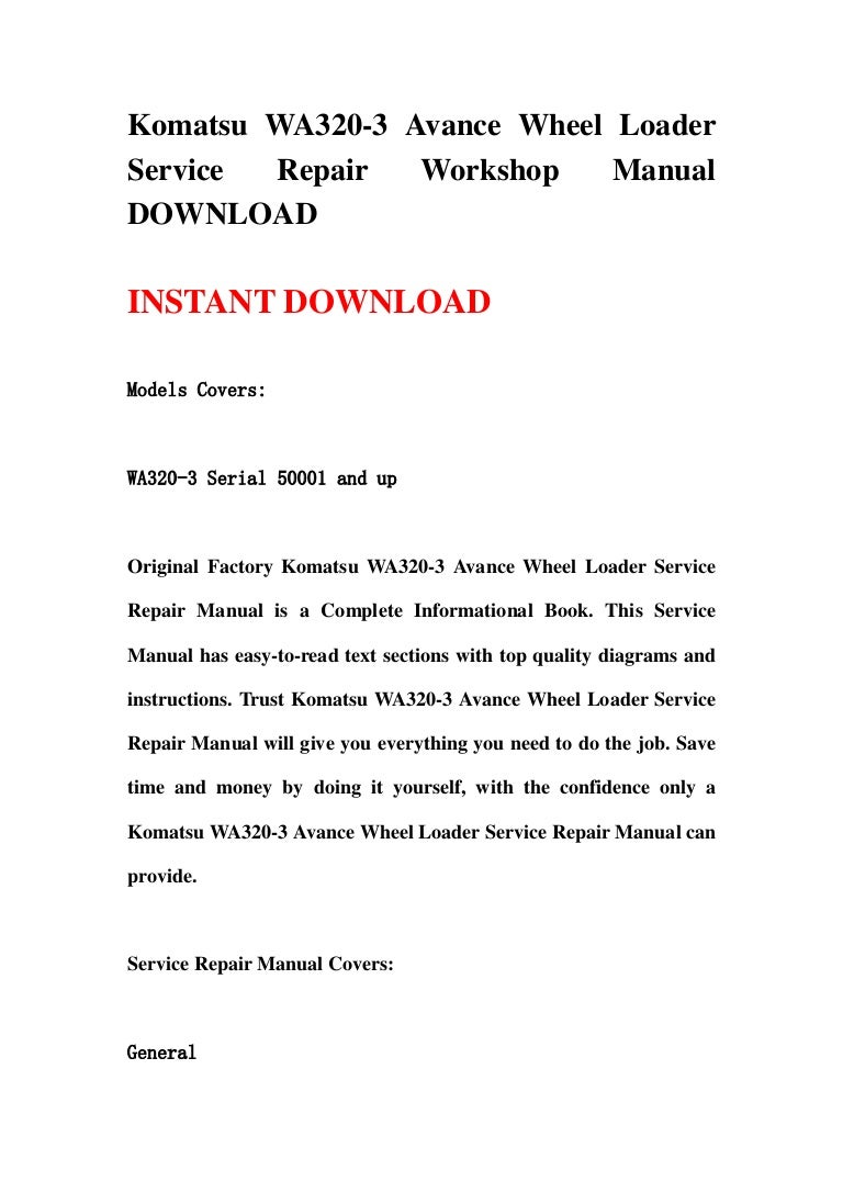 Komatsu Repair Manuals Wa320 3 - Need a Komatsu wheel loader shop manual? here you can find all manuals online for your specific Komatsu machine. Also see Komatsu Engine Manuals, for detailed manuals of. Buy Komatsu WA320-5L Wheel Loader Workshop Repair Service Manual - Part Number # CEBD012003: Software - Amazon.com FREE DELIVERY possible on eligible purchases. Large range of tractor manuals Range of tractor, farming, earthmoving & transport DVDs. Largest range of 'in stock' tractor manuals in Australia & New Zealand.Komatsu backhoe loaders feature rigid 2 and 4 wheels steering models. Strong of a long tradition of quality and a well established experience in the worldwide industry of backhoe loaders, Komatsu aims to set new benchmarks for the market..