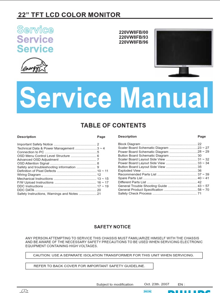 Philips LCD Monitor 220VW8FB service manual | Pixel | Computer Monitor