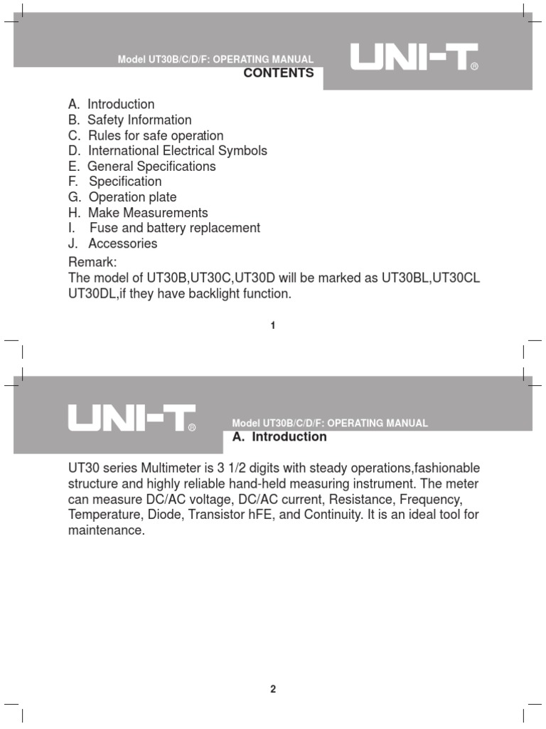 Uni-t UT33D Manuals Manuals and User Guides for UNI-T UT33D. We have 2 UNI-T UT33D manuals available for free PDF download: Operating Manual UNI-T UT30B; UNI-T UT30C; UNI-T UT30D; UNI-T Categories. Multimeter Test Equipment Measuring Instruments Thermometer Analytical Instruments.. UNI-T UT60A Manuals & User Guides. User Manuals, Guides and Specifications for your UNI-T UT60A Multimeter. Database contains 1 UNI-T UT60A Manuals (available for free online viewing or downloading in PDF): Operating manual .. Jul 24, 2014 · - and a user manual The multimeter is compact and it may be even called pocket-size. It is made of high-quality plastic and covered with protective rubber coating. There is a small support stand..
