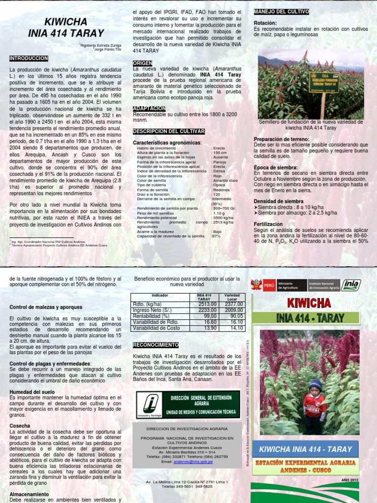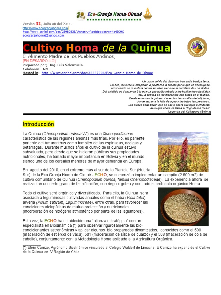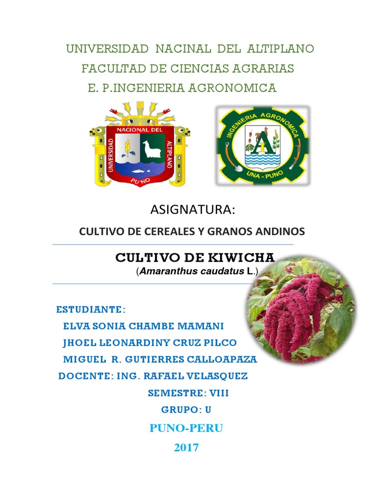 Manual De Cultivo De Kiwicha - Amaranthus es un género de plantas herbáceas y anuales perteneciente a la familia Amaranthaceae. Actualmente, sus especies se distribuyen por la mayor parte de las regiones de clima templado y cálido, posiblemente dispersadas por el ser humano.. MEJORAMIENTO DEL CULTIVO, COSECHA Y POSCOSECHA DE GRANOS ANDINOS: Quinua (Chenopodium quinoa W.), Chocho (Lupinus mutabilis S.), y. Esta biodiversidad constituye una fuente de alimentos funcionales promisorios. En materia de cereales y granos, se puede mencionar a la quinoa (Chenopodium quinoa), el amaranto o kiwicha (Amaranthus caudatus), la chía (Salvia hispánica L.) y el maíz morado (Zea mays L. var. subnigroviolacea Yarchuk)..Quinoa (Chenopodium quince) Contents - Previous - Next. Botanical name: Chenopodium quinoa Wild. Family: Chenopodiaceae Common names. English: quinoa, quinua; Quechua. Proyecto de inversión para la elaboración de mermelada con el fruto del Xoconostle.pdf. Localización e importancia de los recursos minerales. Mineral. Importancia. Localización. Hierro. Se utiliza como materia prima para obtener acero, con el cual se fabrican herramientas y.