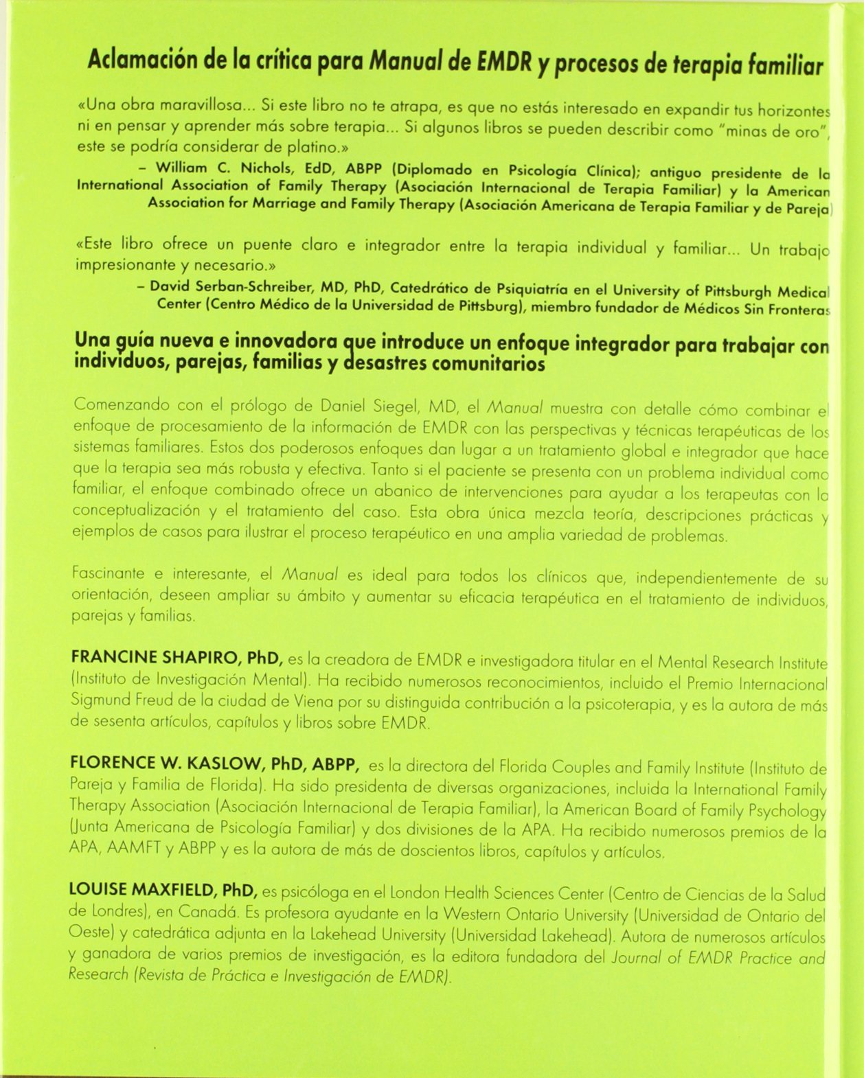 Técnicas de terapia familiar. Salvador Minucin, Charles H. Fishman. Los doctores Minuchin y Fishman, maestros de la terapia familiar, exponen tanto para el neófito como para el especialista un íntegro repertorio de intervenciones, brindándoles de esta manera una guía clara y matizada.. Sep 25, 2013 · EMDR: qué es y cómo funciona El tratamiento de desensibilización y reprocesamiento por movimientos oculares fue largamente estudiado y se le reconoce eficacia en casos de desórdenes. Ve el perfil de Miriam Ramos Morrison en LinkedIn, la mayor red profesional del mundo. Manual de EMDR y procesos de terapia familiar. Pléyades. - Shapiro, F. (2013) Supera tu pasado: Tomar el.