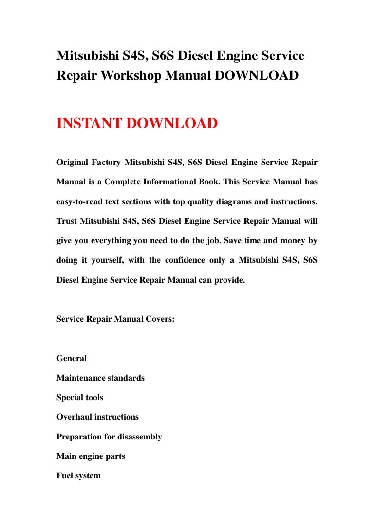 Next story Service Manual Mitsubishi S6S-Y3T61HF, S6S-Y3T62HF Diesel Engine Repair Manual Previous story Service Manual Mitsubishi S4S, S6S Diesel Engine Repair Manual. This is the complete factory service repair workshop manual for the Mitsubishi Diesel Service Manual has easy-to-read text sections with top quality di Mitsubishi S4S, S6S Diesel Engine Workshop Service Repair Manual See more.