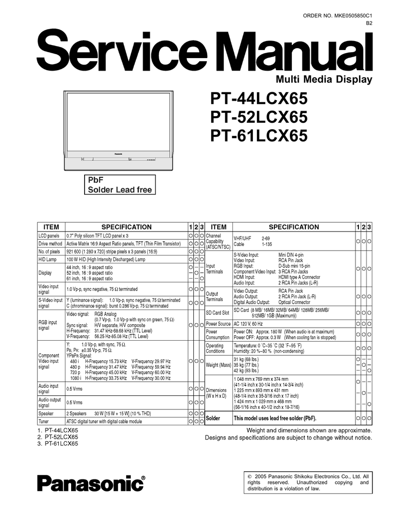 Panasonic Pt 44lcx65 Pt 52lcx65 Pt 61lcx65 Service Manuals - View and Download Panasonic PT-52LCX65-K operating instructions manual online. Multimedia Projection HDTV. PT-52LCX65-K TV pdf manual download. Also for: Pt-44lcx65-k, Pt-61lcx65-k, Pt.
