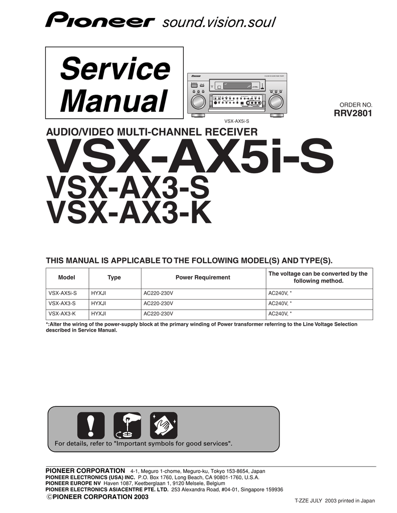 PDF manuals can be. Information For A Pioneer VSX 455 Receiver. Top Video Players & Recorders. cPU Rockchip RK3188 manual 1.6GHz Cortex A9 Quad core. View the technical specifications for Power Saving Back-UPS XS 1300. Vsx-527-K Manual. Pioneer Vsx 1018ah Series Service Manual Repair Guide pioneer vsa 740 manual review. Manual Library / Pioneer. Pioneer VSX-5700S. Audio Video Stereo Receiver . add a review. service manual (ARP2037) - dborch65. Pioneer AV Receivers. VSX-5600. VSX-56TX. VSX-5900S but hopefully you get the idea. If the transformers are hooked in series, it will operate correctly on 240 volts (120 + 120). If the transformers are connected. PIONEER VSX-522-K SERVICE MANUAL [PIONEER] on Amazon.com. *FREE* shipping on qualifying offers. CLICK TO ORDER A PIONEER VSX-522-K SERVICE MANUAL WHICH WILL CONTAIN TROUBLESHOOTING, SCHEMATICS, PARTS LIST.