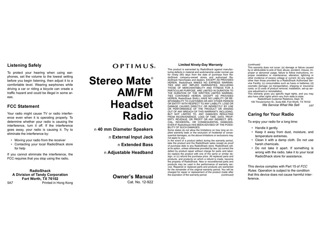 Radio Shack Stereo Mate 12-922 User's Manual | manualzz.com