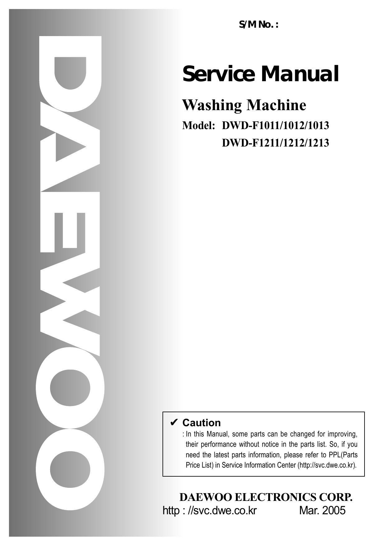 This manual contains valuable information about how to operate and maintain your washer property and safely.. Title: Repair Manual Daewoo Dwd F1211 1212 1213 Wash, Author: CaraBisson, Name: Repair Manual Daewoo Dwd F1211 1212 1213 Wash, Length: 5 pages, Page: 2,. Daewoo Dwd F1011 Service Manual DWD-F1011/1012/1013'S/F1211/1212/1213'S. Washing Machine Instruction Manual. CONTENTS. Page. A NOTE TO YOU. Thank you for buying a DAEWOO..