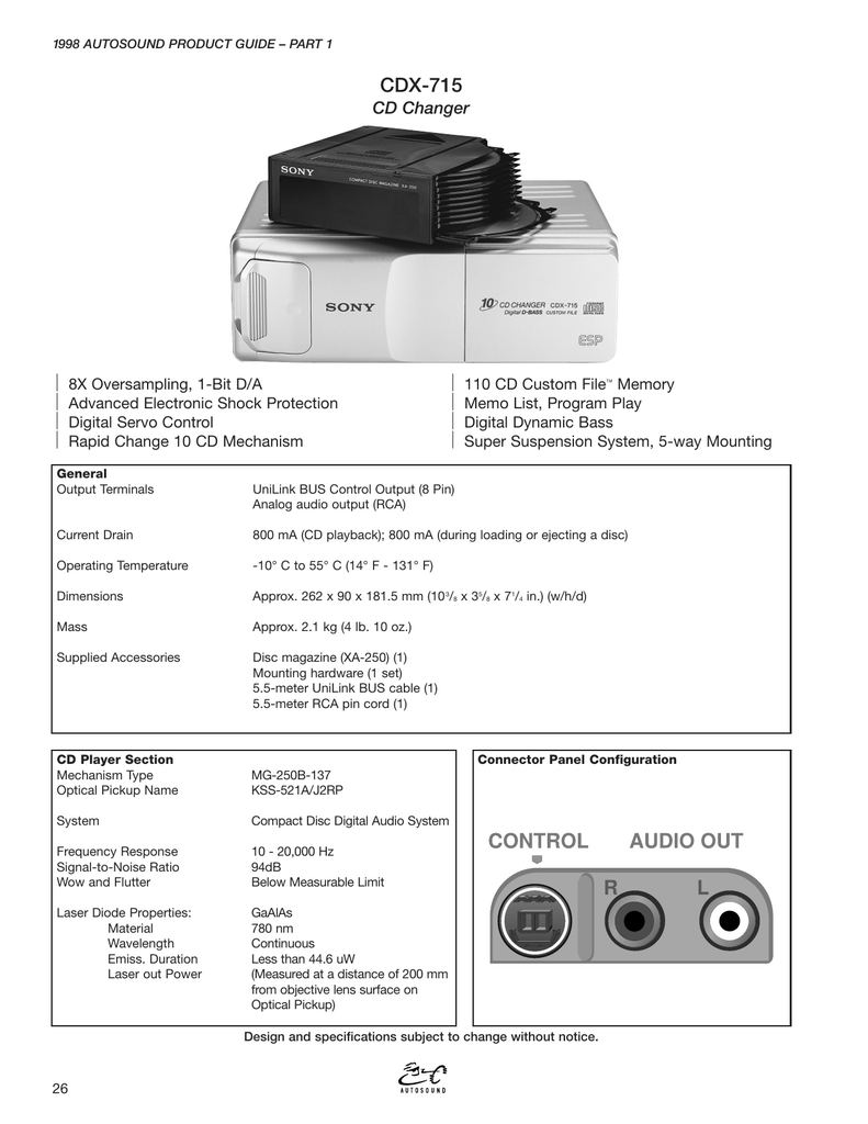 Sony 10 Cd Changer Manual - Download SONY CDX-605 CD CHANGER OWNERS MANUAL Car wirings and schematics,automobile documentation, auto repair guides,car audio manuals, car stereo. Manual Library / Sony. Sony CDP-C900. 10-Disc Compact Disc Player (1989-91) add a review. Specifications. Disc format: CD (10 disc multi play) Digital converter: 16-bit, 8 x oversampling. instruction/owners manual - karodimitrov. Related Catalogues. General. HiFi. Take your music to the next level with the CDX-P1280 12-disc CD Changer. The CDX-P1280 plays CD Audio, CD-R, and CD-RW discs, and has an 8x oversampling filter and a 1-bit D/A converter for clean, powerful music. Control it with many Pioneer "IP-Bus" headunits from 2009 and prior (check the headunit's specification page or owner's manual for.Aug 22, 2003 · Manual cassette release on Sony 10 CD car player Search Forums; Recent Posts; Aug 17, 2003 #1. Licensed to Quill Guest. Got a CDX-52 10 CD changer for my car which wont release its cassette. I have the top off and still cant find any way of manually releasing the CD Sony CDX-705 10 CD Changer. Panasonic Cassette player. Repair needed on. CD players and changers are difficult to work on because of the compact size, mechanical mechanisms, and electronics to deal with. You might be better off replacing the unit itself then trying to repair. The problem would be finding a 10 disc changer that you like.. May 22, 2004 · My wife had a Sony CD changer in her car. It was mounted in the trunk and had a six CD magazine with it. It wasn't working so I bought her a new in-dash model for her car. Now here's the problem, we got the changer out of the trunk but the magazine is stuck in there. For the life of me, I can't figure out how to get the magazine out of the changer..