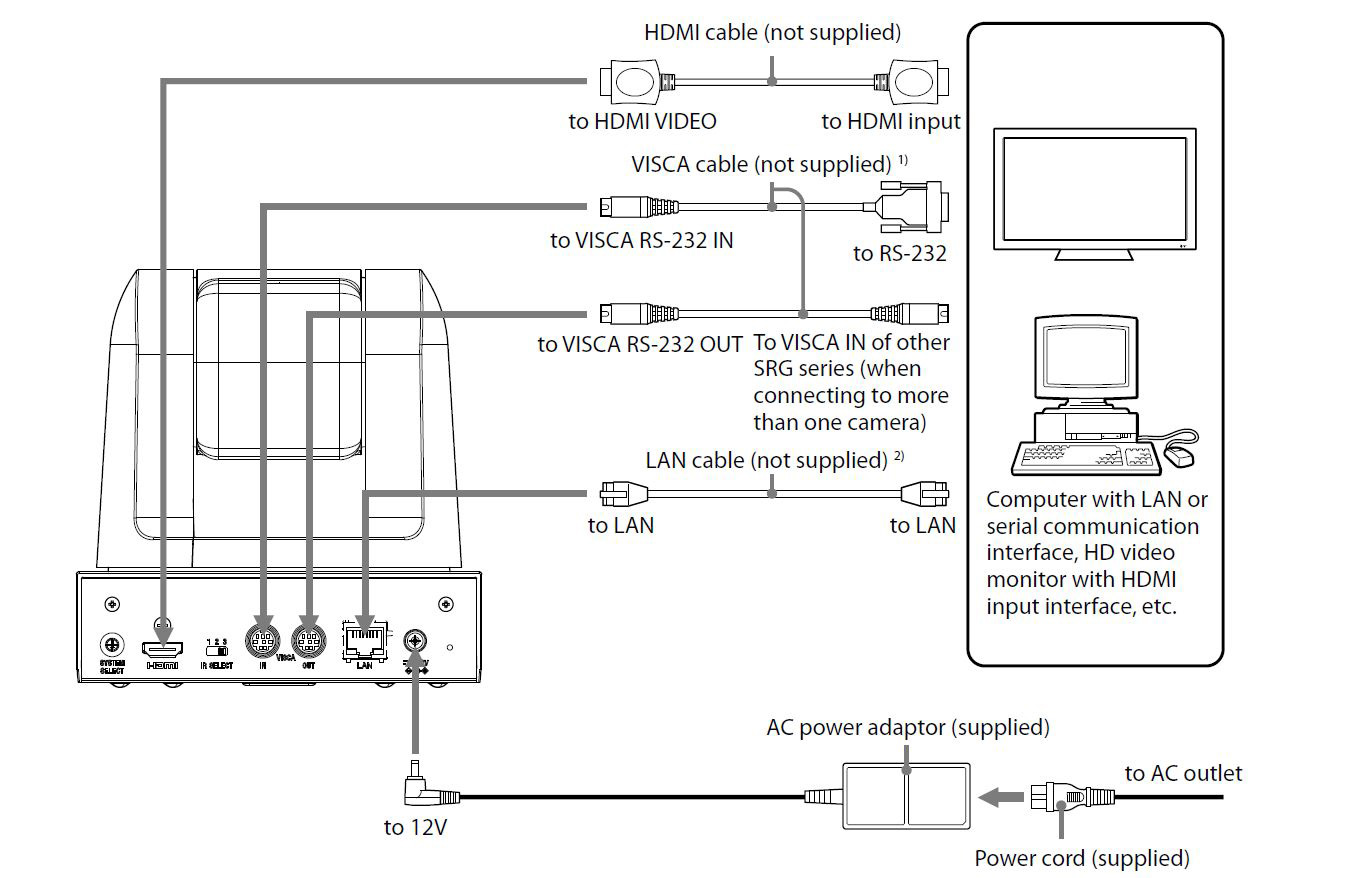 VISCA RS-232C IN RS-232C cable* VISCA RS-232C RM-BR300 Remote Control Unit DC IN 12V AC power adaptor* * supplied with the RM-BR300 Note When using the VISCA RS-232C connectors, check that the BOTTOM switch on the bottom of the camera (page 19). 25FT Visca Control cables 9 pin D-Sub to 8 pin Mini-Din Plug RS-232 VISCA control cable The 25FT Visca Control cables 9 pin D-Sub to 8 pin Mini-Din Plug RS-232 VISCA control cable , is a cable designed to connect music keyboards or synthesizers to a PC computer via the originating instrument's mini-DIN 8-pin host output.. RS-232C