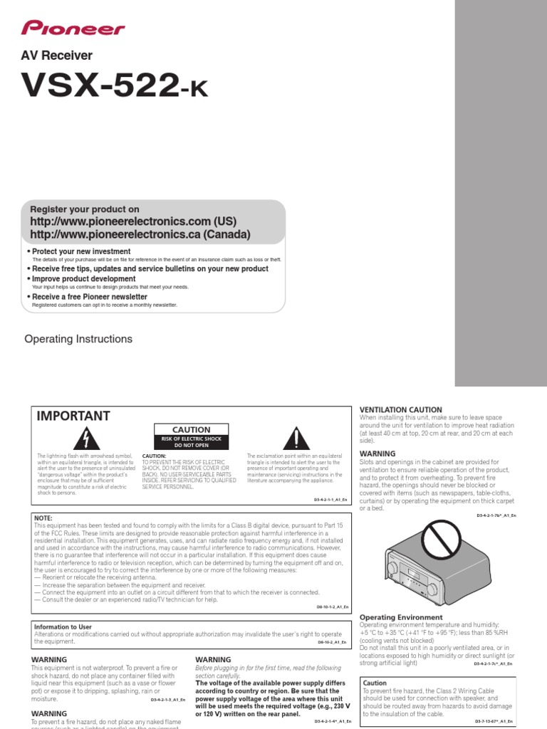Pioneer VSX522 Receiver - Manual English | Hdmi | Electrical Connector