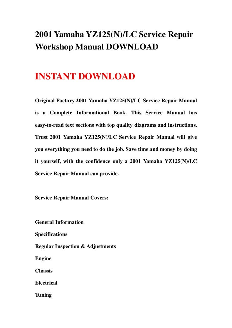 Yamaha YZ125 1994 – 2001 Clymer Owners Service and Repair Manual. By admin, on September 21st, 2018 2001 Clymer Owners Service Repair Manual Covers the Yamaha YZ125 Repair Manual 1994-2001Contents: Download Mazda 323 4WD GT-R Complete Workshop Service Repair Manual 1990 1991 1992 1993;. Sep 27, 2013 · Yamaha Yz125 Service Repair Manual Download 2006 Onward DOWNLOAD HERE. Full & Complete Service Repair Workshop Manual Supplied In Easy To Read PDF Format.. Get the best deal for Yamaha YZ Motorcycle Repair Manuals & Literature from the largest online selection at eBay.com. Browse our daily deals for even more savings! Free delivery and free returns on.