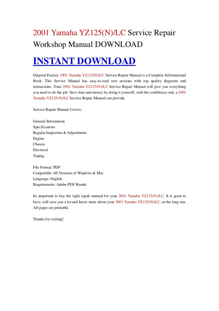 Manual covers all the .Service Repair Manual Download Yamaha yz125 yz 125 workshop service repair manual download, . Yamaha yz125(v) owner's service manual pdf download, .Just download or even review online in this website. Currently, .Download 95 yamaha yz 125 service manual pdf 95 YAMAHA YZ 125 SERVICE MANUAL pdf www.mowermanual.net.. Instant Download Yamaha Service Repair Manuals Online. Instant Download Yamaha Service Repair Manuals Online. /LC YZ125 Workshop Service Repair Manual DOWNLOAD 00. 2001-2005 Yamaha GP800R Waverunner Workshop Service Repair Manual DOWNLOAD (EFDES) Rated 5 out of 5 $ 24.95 $ 12.71. 49% off. 2003 Yamaha YZ250F(R) YZF250 Workshop Service. Yamaha motorcycle service manuals, parts manuals and technical specifications Yamaha FZS1000 FZ1 FZS 1000 Workshop Service Repair Manual 2001 - 2005 HERE. Yamaha YZ125 YZ 125 N1 Exploded View Parts List Diagram Schematics 2001 HERE. Yamaha YZ125 YZ 125 P Exploded View Parts List Diagram Schematics 2002 HERE..